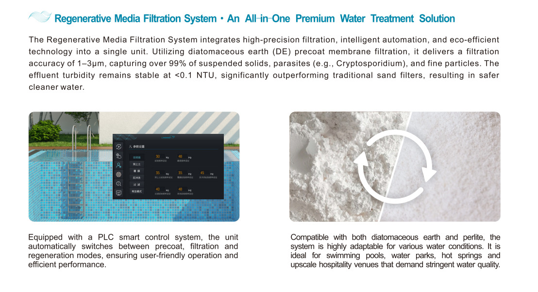 The regenerative mediafiltration filtration System integrates high-precision filtration, intelligent automation, and eco-efficient technology into a single unit. Utilizing diatomaceous earth (DE) precoat membrane filtration, it delivers a filtration accuracy of 1-3μm, capturing over 99% of suspended solids, parasites (e.g.,Cryptosporidium), and fine particles. The effluent turbidity remains stable at <0.1 NTU, significantly outperforming traditional sand filters, resulting in safer cleaner water.